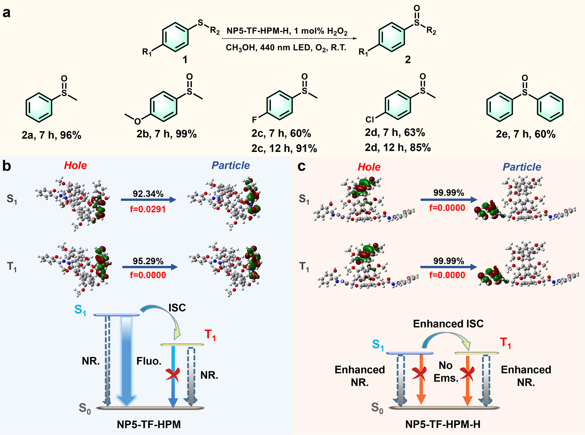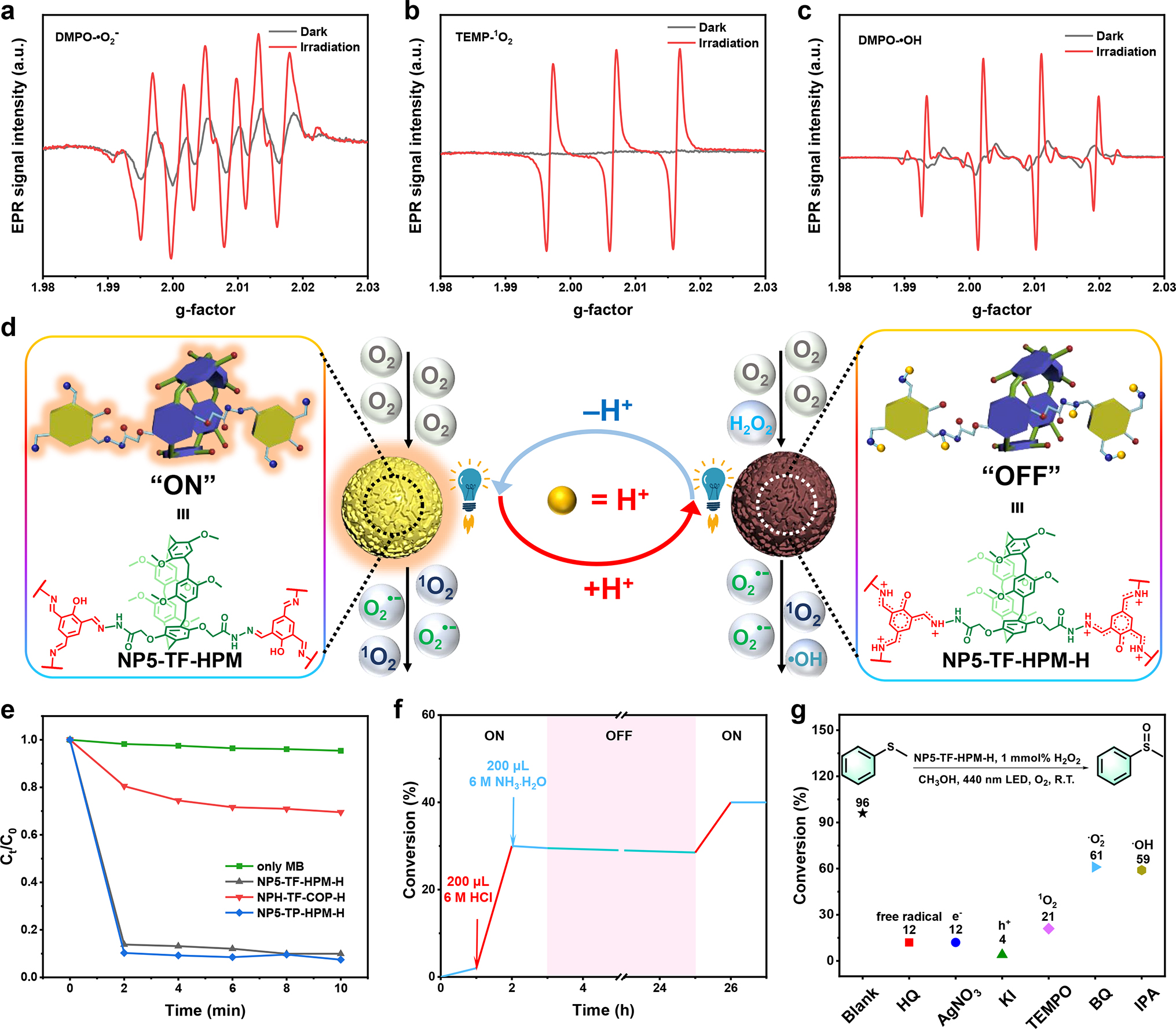 图2.NP5-TF-HPM-H光催化活性氧生成及光催化硫醚氧化的性能表征