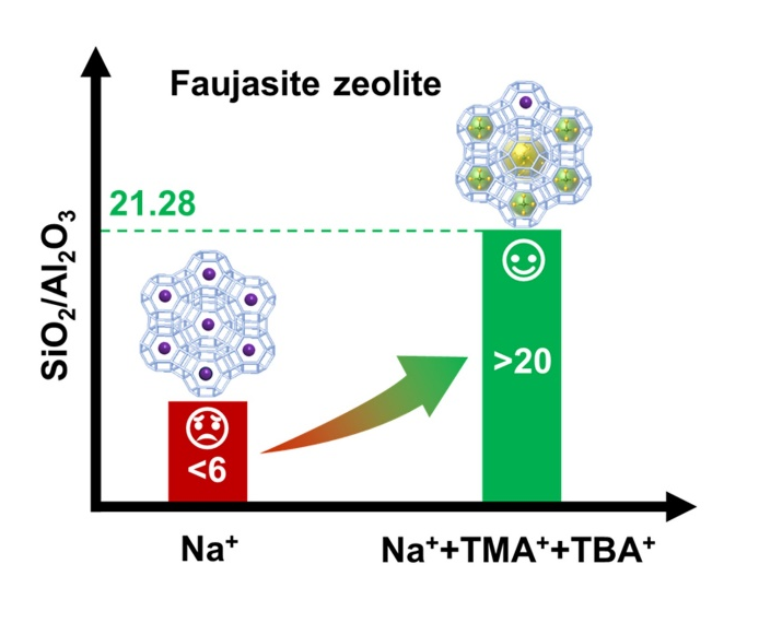 Y型分子筛(FAU拓扑结构)作为流化催化裂化及加氢裂化等工业催化过程的核心催化材料,其性能直接受骨架硅铝比(SiO2/Al2O3)调控。传统工业合成采用无机阳离子(如Na+)导向的水热法,因阳离子高电荷密度导致骨架硅铝比受限(SiO2/Al2O3=3-6),所得产物水热稳定性不足,需经复杂后处理方可应用。目前硅铝比提升策略主要包括后处理法与直接合成法:前者通过酸/碱处理、氟硅酸铵脱铝补硅或蒸汽高温处理实现硅铝比调整,虽在工业中广泛应用,但存在显著缺陷——处理过程导致结晶度下降、酸强度衰减及非骨架铝生成,且受限于浓度梯度效应,晶粒内部易形成脱铝梯度,致使酸位点分布不均;此外,工艺复杂、成本高昂、产物收率低及设备腐蚀等问题亦制约其发展。相较而言,直接合成法可一步制得结晶度高、铝分布均一且骨架稳定性可控的高硅Y分子筛,但因高硅骨架构建能极高,高硅Y分子筛的直接合成一直是分子筛合成领域的一大挑战。