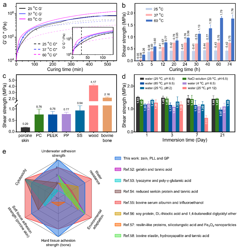 图2. (a) ZS/PLL-GP1.2胶粘剂在不同温度下的时间扫描曲线,(b-d) ZS/PLL-GP1.2胶粘剂在不同时间,温度,基底和水环境下的搭接剪切强度(e) ZS/PLL-GP1.2与文献报道的水下蛋白质胶粘剂的综合比较。