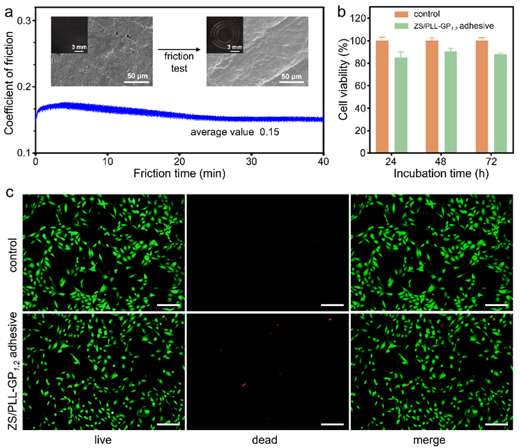 图3.(a)ZS/PLL-GP1.2涂层的摩擦特性,(b,c)ZS/PLL-GP1.2胶粘剂的细胞毒性