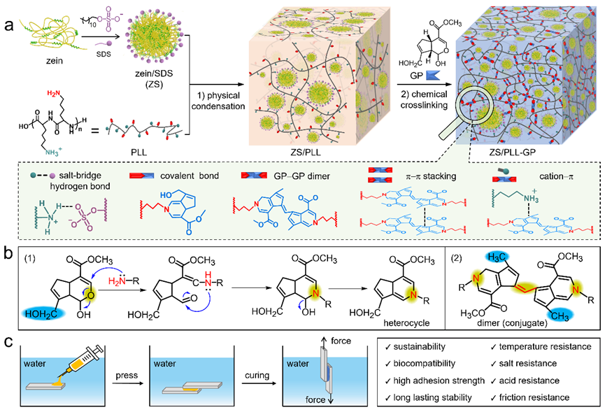 玉米蛋白是一类天然可再生、来源广泛、成本低廉、生物相容且可降解的生物大分子,是理想的生物胶粘剂原料。受天然沙堡蠕虫黏性蛋白中静电物理浓缩的启发,该团队首先利用阴离子两亲分子对玉米蛋白进行表面改性,获得了负电性玉米蛋白胶体(如图1a所示),随后将玉米蛋白胶体与正电性聚赖氨酸在水溶液中混合,两者通过多重静电作用浓缩形成具有"动态网络"的可塑型水下胶粘剂,可完美贴合各种不规则表面,实现有效界面初黏。物理浓缩的动态静电网络具有可逆的去水合与重新水合成胶的能力,可将生物交联剂京尼平按需锁定在网络结构中,便于后续分步化学交联。此外,物理浓缩使蛋白质与聚肽分子链紧密结合,为后续京尼平介导的化学交联和本体固化创建有利空间环境。作者通过紫外、红外、X射线光电子能谱能手段验证了交联固化的分子机制,即玉米蛋白和聚赖氨酸中的伯胺首先通过亲核反应进攻京尼平呋喃环中与氧相连的碳正离子,随后经重排、关环以及消除反应形成N取代的氮杂环(如图1b所示)。这一较快的动力学反应过程有利于提高动态网络的疏水性,并驱动网络结构的进一步紧密聚集。最后,两个邻近的氮杂环经过缓慢的共价交联形成较大共轭结构的二聚结构,实现网络结构的固化(如图1b所示)。