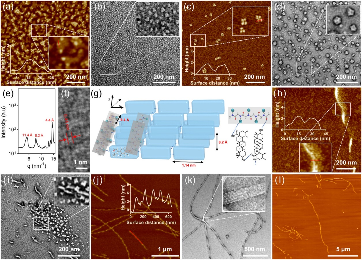 本研究通过分子设计在系统中引入酸响应基团和靶向配体,实现了UA在肿瘤微环境(TME)中的精准递送。研究表明,该纳米系统具有独特的结构转换特性:在中性条件下保持稳定的螺旋纳米纤维形态,而在酸性TME中则可逆转变为病毒样纳米颗粒,这种形态转变显著增强了药物在肿瘤组织中的渗透能力。