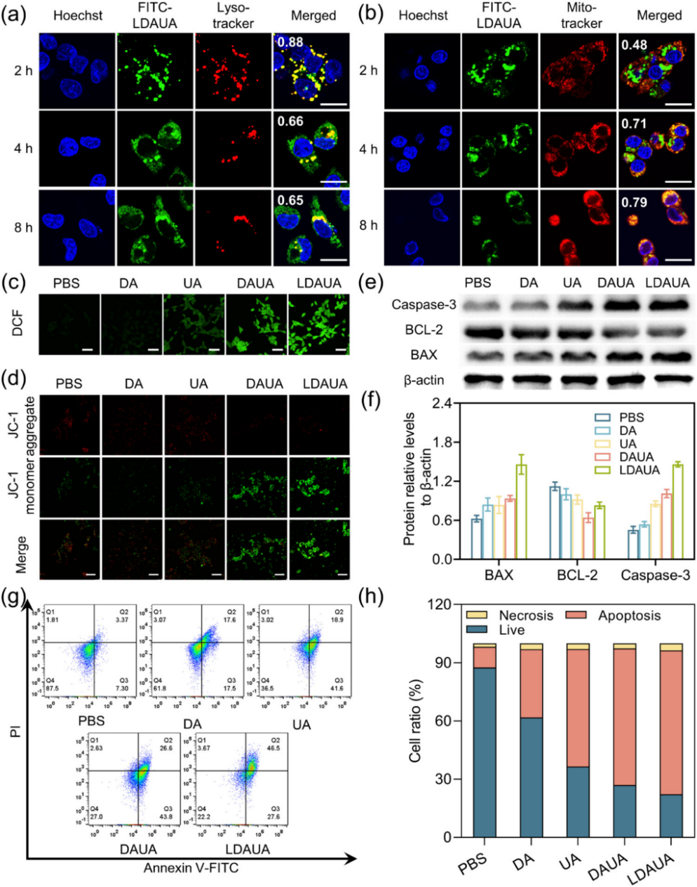 机制研究发现,肿瘤细胞内化后,病毒样纳米颗粒能够有效实现溶酶体逃逸并在线粒体周围特异性富集。在活性氧(ROS)作用下,硫醚键发生氧化断裂,触发UA及活性聚类肽的协同释放,进而通过诱导线粒体损伤特异性激活凋亡通路。值得注意的是,部分纳米颗粒在细胞质中性环境中可重新组装为纤维结构,这种动态重构行为不仅延长了药物在细胞内的滞留时间,更强化了线粒体靶向效应和治疗效果(图3)。该递送系统展现出显著的协同抗肿瘤效应,其治疗效果显著优于单一UA或聚类肽组分。动物实验进一步证实,该体系在抑制肿瘤生长和转移方面具有显著优势。