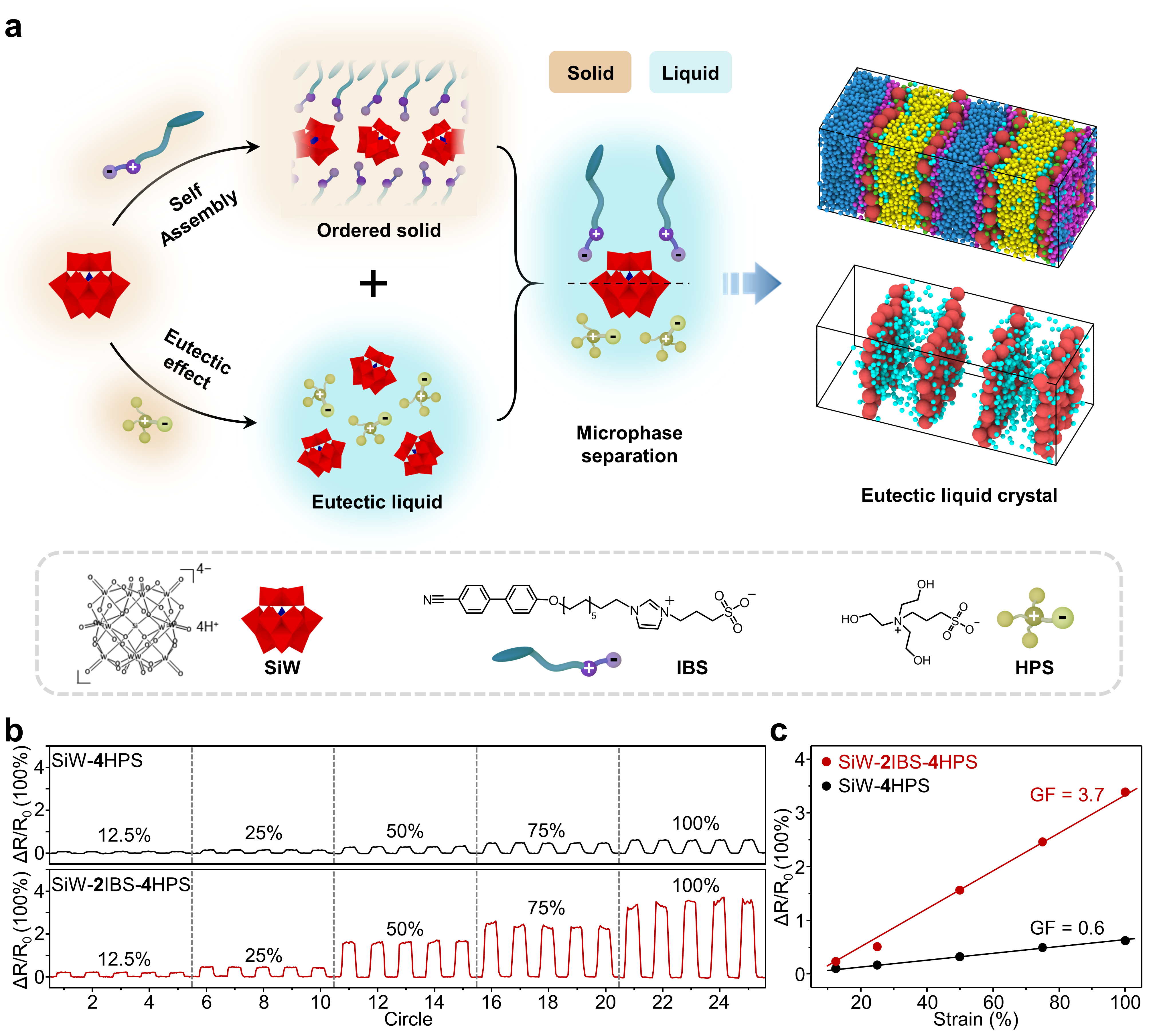 图1. (a)层状液晶质子导体的设计与微相结构;(b, c)在不同应变下的相对电阻变化率及灵敏度。