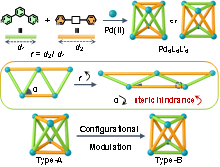 生物分子构型的精确调控是维持生命系统结构完整性和功能特异性的基本机制。例如,酶的构型变化导致活性中心的暴露或隐藏,从而影响其与底物的结合以及催化效率。在各种人工合成的超分子结构中,由“裸”钯(II)离子构建的金属有机笼(MOCs)因其配位键的明确方向性和稳定性,已成为模拟生物分子的理想选择。目前,有关MOCs构型调控的研究主要集中在使用非对称配体构建的同质笼上,而有关异质笼构型调控的报道却非常少,主要挑战在于:(1)避免配体的自恋型自分类;(2)抑制统计混合物的形成;(3)精确调控不同构型间的能量差异。