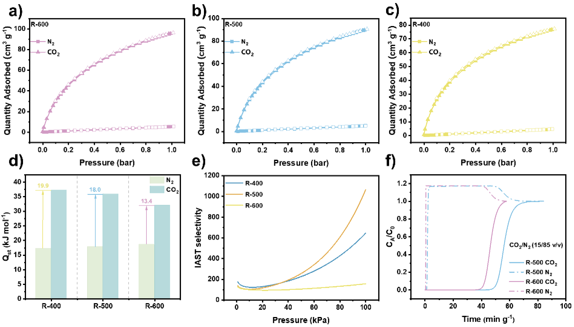 图2.CDs-RHO沸石的CO2/N2吸附分离性能及动态穿透行为表征
