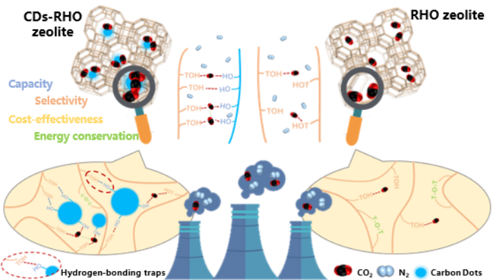 图1. CDs-RHO沸石中的氢键陷阱及CO2吸附机制示意图
