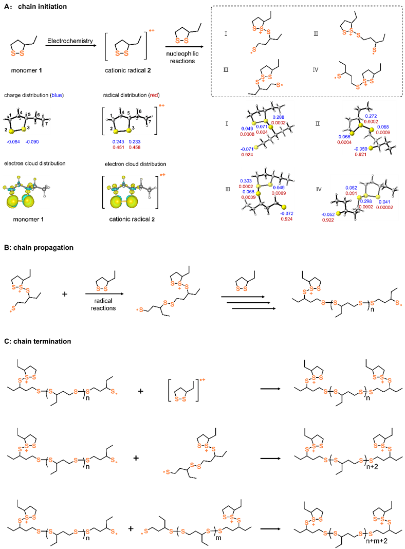 作者结合实验与DFT计算,揭示了阳离子自由基引发机制的核心作用:1)循环伏安和差分脉冲伏安实验证实硫辛酸单体在阳极经历了吸附控制的单电子氧化过程(n = 1.04);2)DFT计算显示1,2-二硫戊环中S原子具有最高的电子云密度(Fukui函数值0.340),在氧化过程中优先失去电子形成高活性阳离子自由基TASS·+(图2a);3)脉冲动力学实验证明该聚合反应为硫自由基主导的链增长模式,XPS检测到末端锍鎓基团的特征峰(166.5eV),最终经双分子耦合终止形成线性聚合物(图2b-c)。该机理通过流变学线性特征(无橡胶平台区)及阴离子无关性实验得到进一步验证。