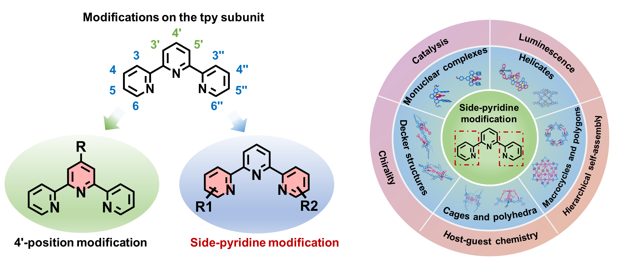 图一 三联吡啶的改良策略和基于三联吡啶侧边吡啶修饰的配位超分子结构与性能