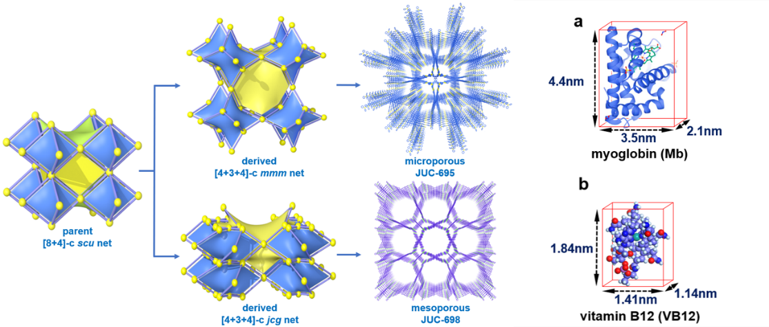 针对这一瓶颈,方千荣团队提出了“拓扑衍生(Topological Derivative)设计策略”,以 edge-transitive 的 scu 网络为拓扑母体,通过 对称性受控的有机关联单元选择,构建出不同衍生拓扑(mmm 与 jcg)对应的 3D COF 系列。研究表明,这两类拓扑在连接方式与侧向窗口几何上的差异,导致完全不同的穿插行为:mmm 系列在键长增长过程中表现出不可预测的多方向穿插,使孔径出现“2.6→3.9→1.2 nm” 的不规则变化;相反,jcg 系列因其较窄的侧向窗口与限制性平面连接方式,可以有效抑制错位穿插,实现孔径随节点延长而 单调放大至 5.1 nm,创造了当前已报道三维 COF 孔径的最新纪录。该系列材料通过 PXRD、Rietveld 精修、HRTEM、气体吸附以及 VB12 / Mb 大分子包载实验系统验证了结构模型与孔道可进入性,证明拓扑衍生策略能够在三维 COF 中有效克服穿插效应,实现规则大孔的稳定构筑。