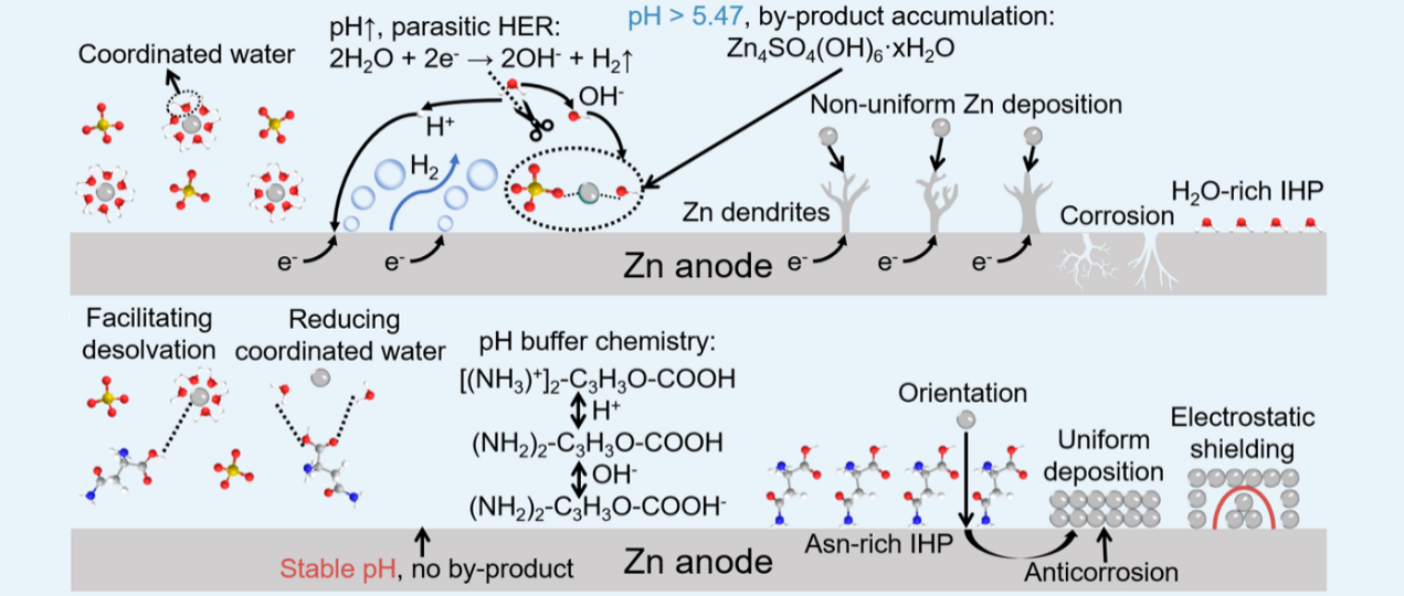 针对上述难题,徐吉静教授团队从天然生物分子中寻找灵感,在常规水系电解液中创新性地引入了多功能生物有机分子——天冬酰胺(Asn),实现了对电池体相电解液环境与电极/电解液界面微环境的双重精准调控。研究表明,Asn分子独特的官能团能够动态调节体相电解液的pH值,创造更温和的反应环境;同时,分子内部富含的多个亲锌位点能有效重构锌离子的溶剂化壳层,引导锌离子实现快速有序传输。在正极侧,优化后的电解液构筑了高稳定性的界面,有效抑制了活性物质的溶解与损失。在锌负极侧,Asn分子会优先吸附在电极表面,形成一道动态保护层,主动“移除”双电层中具有高反应活性的水分子,从而从根源上遏制了析氢、腐蚀等副反应的发生。