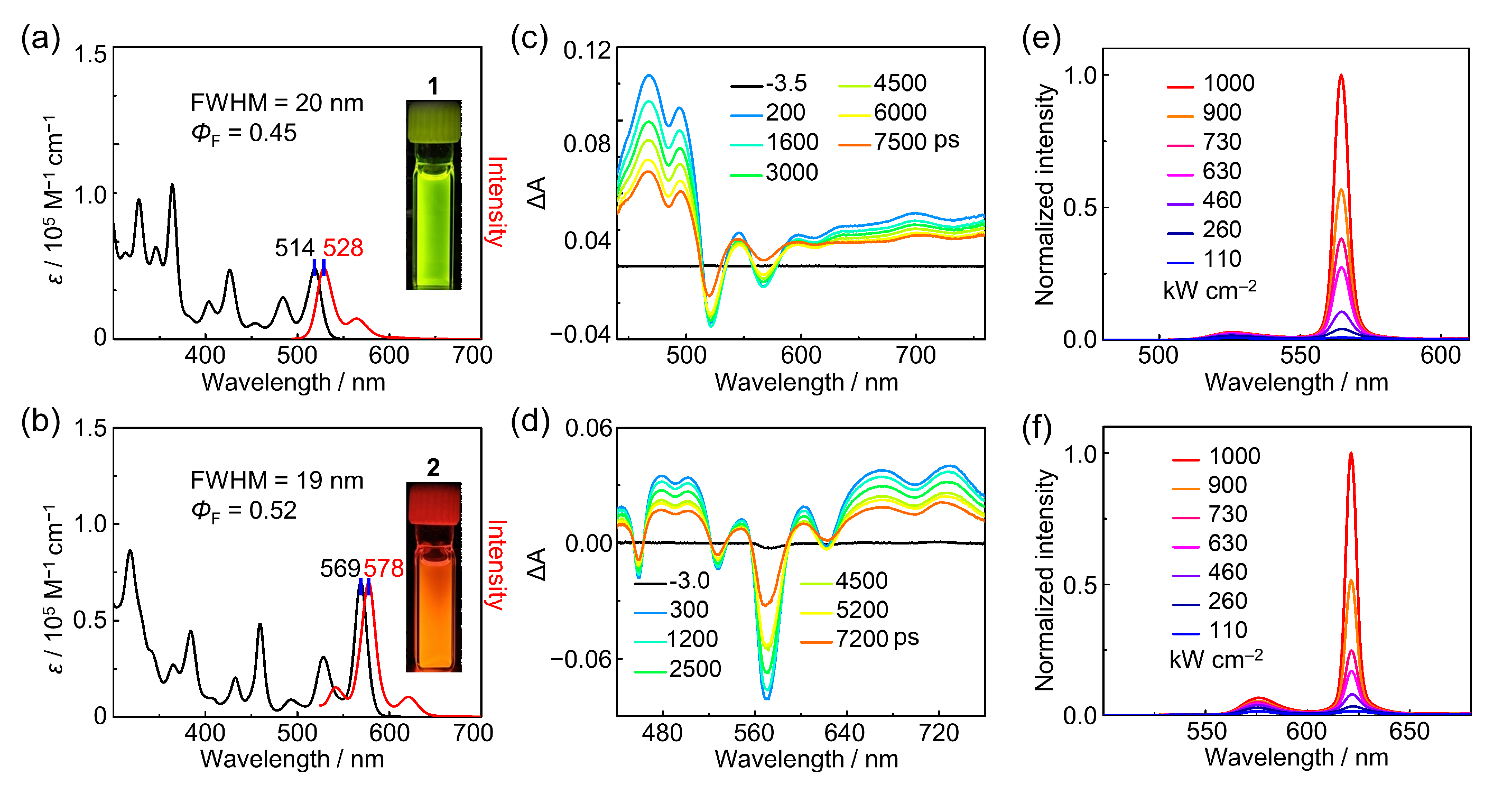 图3.分子1和2的(a,b)吸收和荧光光谱,(c,d)瞬态吸收光谱和(e,f)掺杂薄膜的放大自发发射光谱