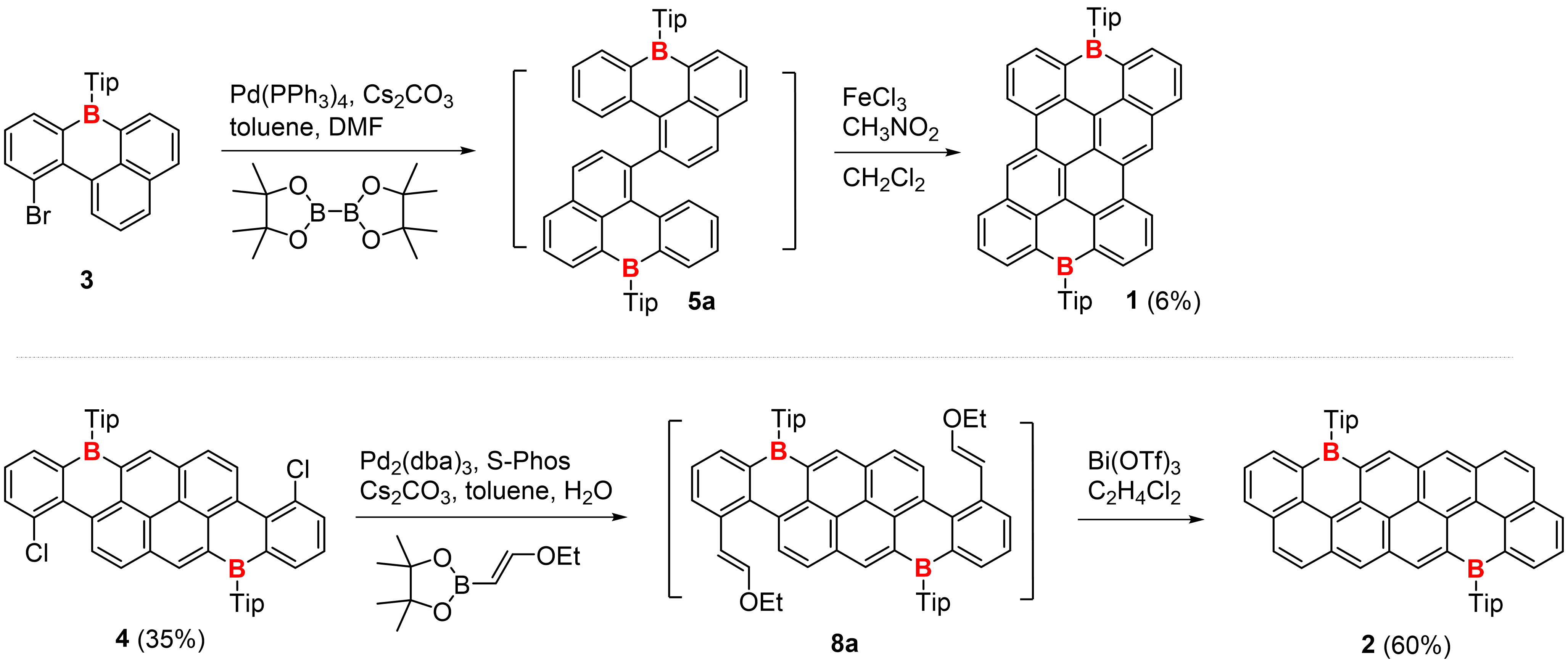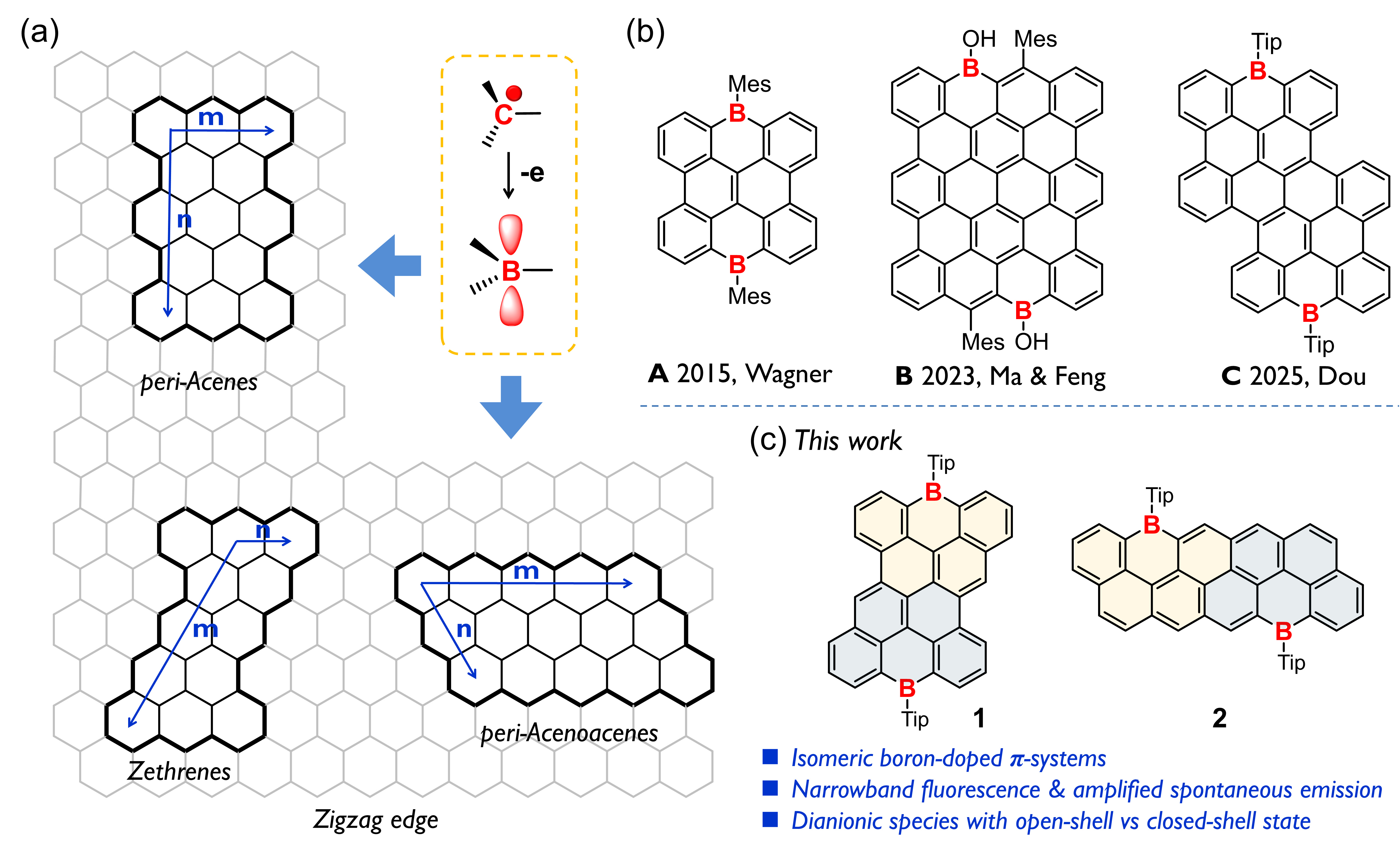 图1.硼杂并苯体系的(a)设计策略和(b,c)化学结构