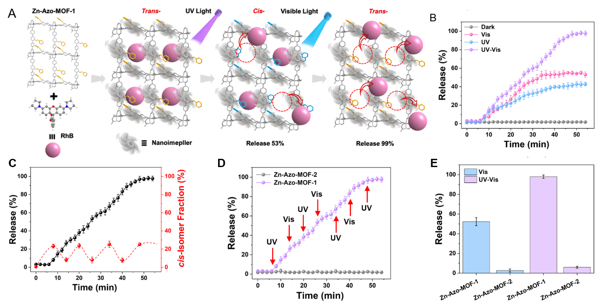 图2. MOF基纳米叶轮在紫外-可见光交替照射下成功实现高效按需货物释放