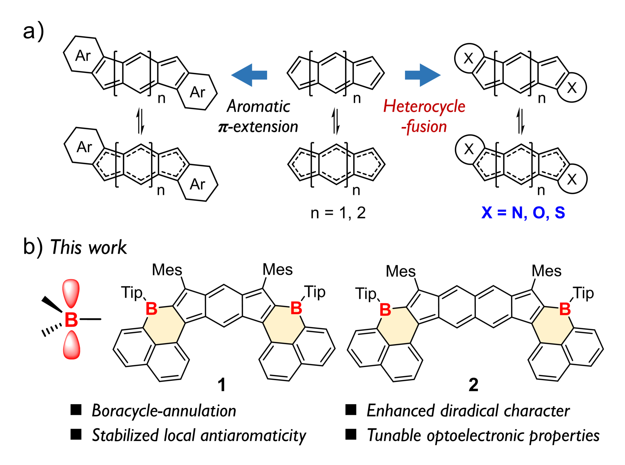 图1.(a)代表性反芳香环烃(ID和DCN)的设计策略;(b)硼环扩展环烃的化学结构。