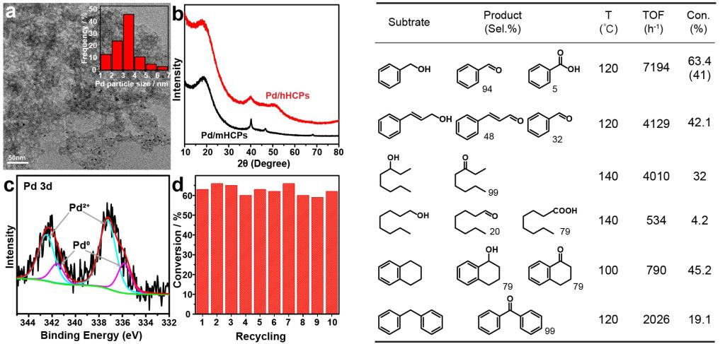 图3 a. 担载钯纳米粒子的超交联聚合物的TEM图 b. 担载钯纳米粒子的超交联聚合物的XRD图谱 c. 担载钯纳米粒子的超交联聚合物的XPS Pd 3d图谱 d. 催化剂循环性能的测试 e. 催化性能表格