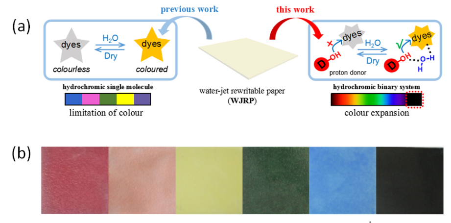 图1(a)基于二元体系构筑的水致变色可重复擦写纸(右)与前期工作(左)的机理示意图;(b)不同颜色喷水打印显示实物图
