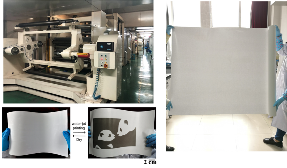 图3基于PET基材的大面积水致变色可重复擦写纸的生成车间照片及黑色喷水打印效果图