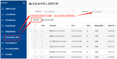 研究生师生信息综合库”(//one.xingbaycvip.com/),在【奖学金成果积分】栏进行查询(见下图说明)。初评获奖候选人再次核实自己是否填报【奖学金申报人信息】,涉及发放奖学金银行卡信息等。