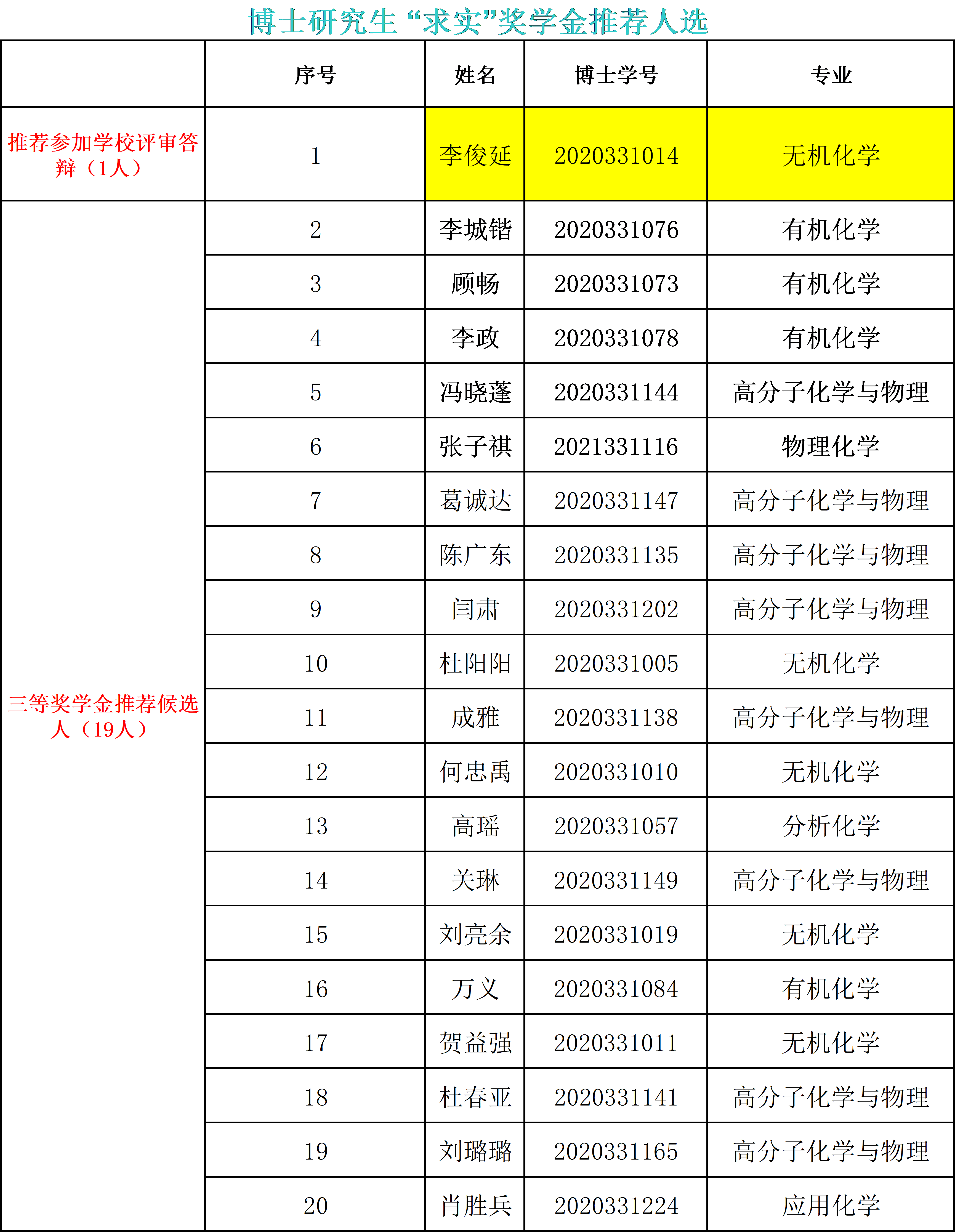 依据《杏吧原创 博士生“求实”奖学金评选办法》要求,杏吧原创 采取研究生个人申报、导师推荐、学院研办审核材料、评审工作小组初评推荐、杏吧原创 研究生奖学金评审委员会审核确定的方式进行评定,现拟推荐1名博士李俊延(2020331014))参加学校评审答辩,竞争一等、二等“求实”奖学金;拟推荐李城锴等19名博士为 “求实”奖学金三等奖候选人(名单见附件),如有问题请联系赵晓杰老师,电话13504470223。