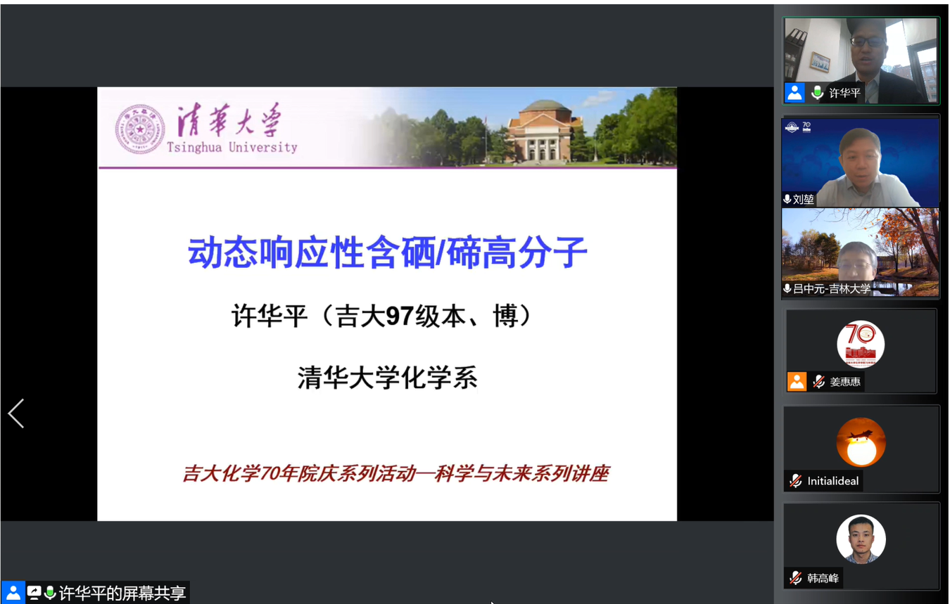 5月8日上午,清华大学化学系教授、国家杰出青年科学基金获得者许华平应邀线上做客“吉大化学七十年——科学与未来系列讲座”,以“动态响应性含硒/碲高分子”为题,为学院师生作学术报告。