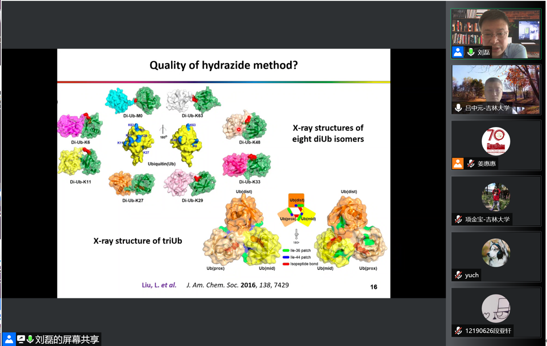 5月14日上午,清华大学化学系教授、国家杰出青年科学基金获得者刘磊应邀线上做客“吉大化学七十年——科学与未来系列讲座”,以“蛋白质化学合成探索”为题,为学院师生作学术报告。