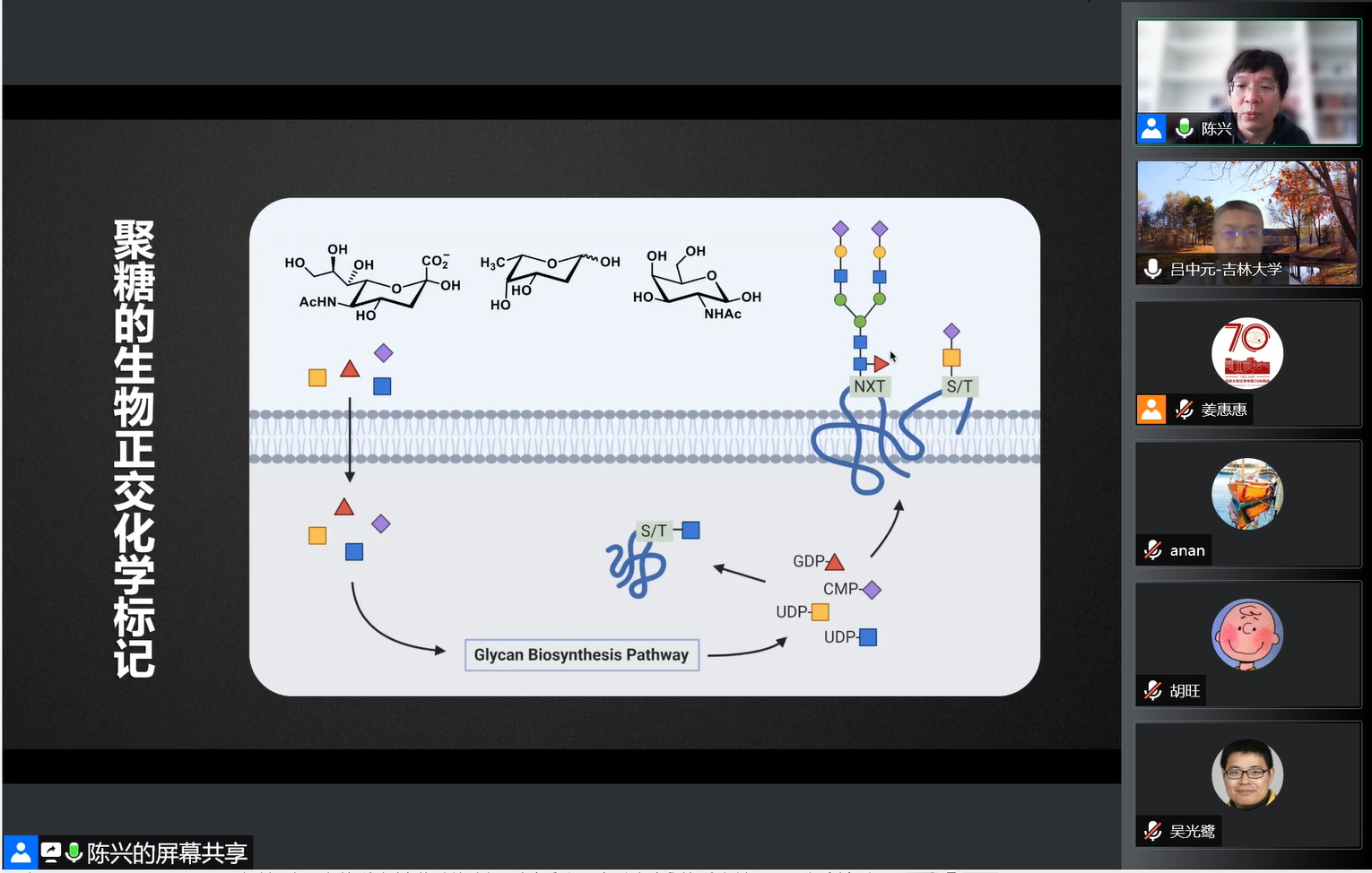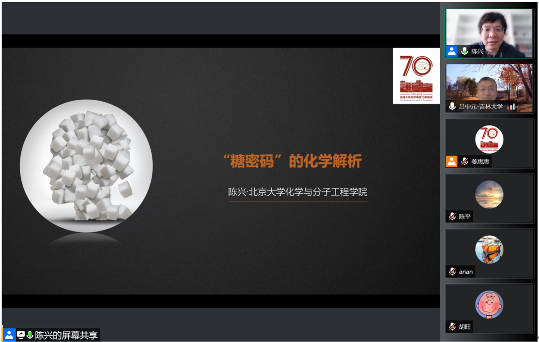 5月21日上午,北京大学化学与分子工程学院教授、院长,国家杰出青年科学基金获得者陈兴应邀线上做客“吉大化学七十年——科学与未来系列讲座”,以“‘糖密码’的化学解析”为题,为学院师生作学术报告。