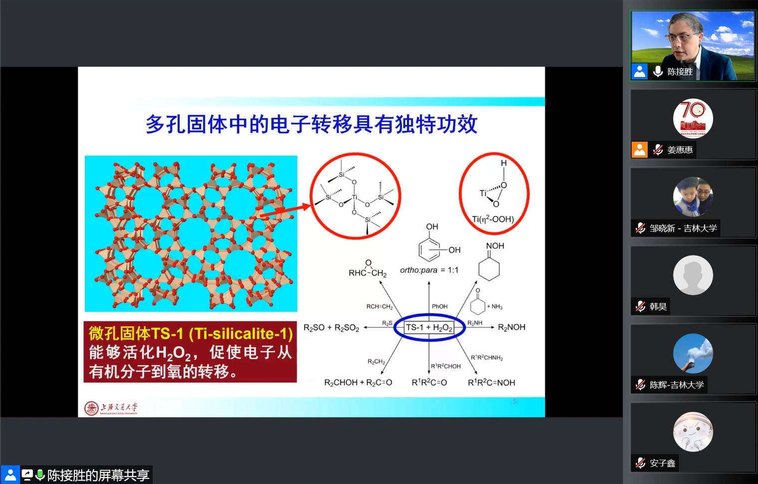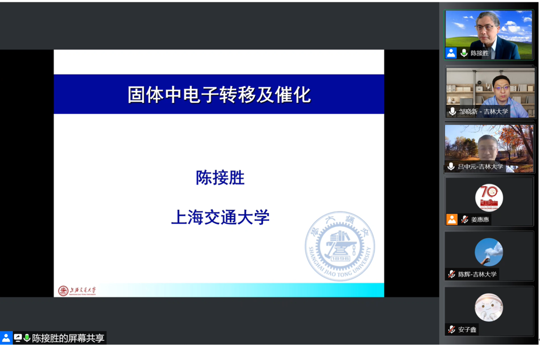 5月22日上午,上海交通大学化学化工学院教授,国家杰出青年科学基金获得者陈接胜应邀线上做客“吉大化学七十年——科学与未来系列讲座”,以“固体中电子转移及催化”为题,为学院师生作学术报告。