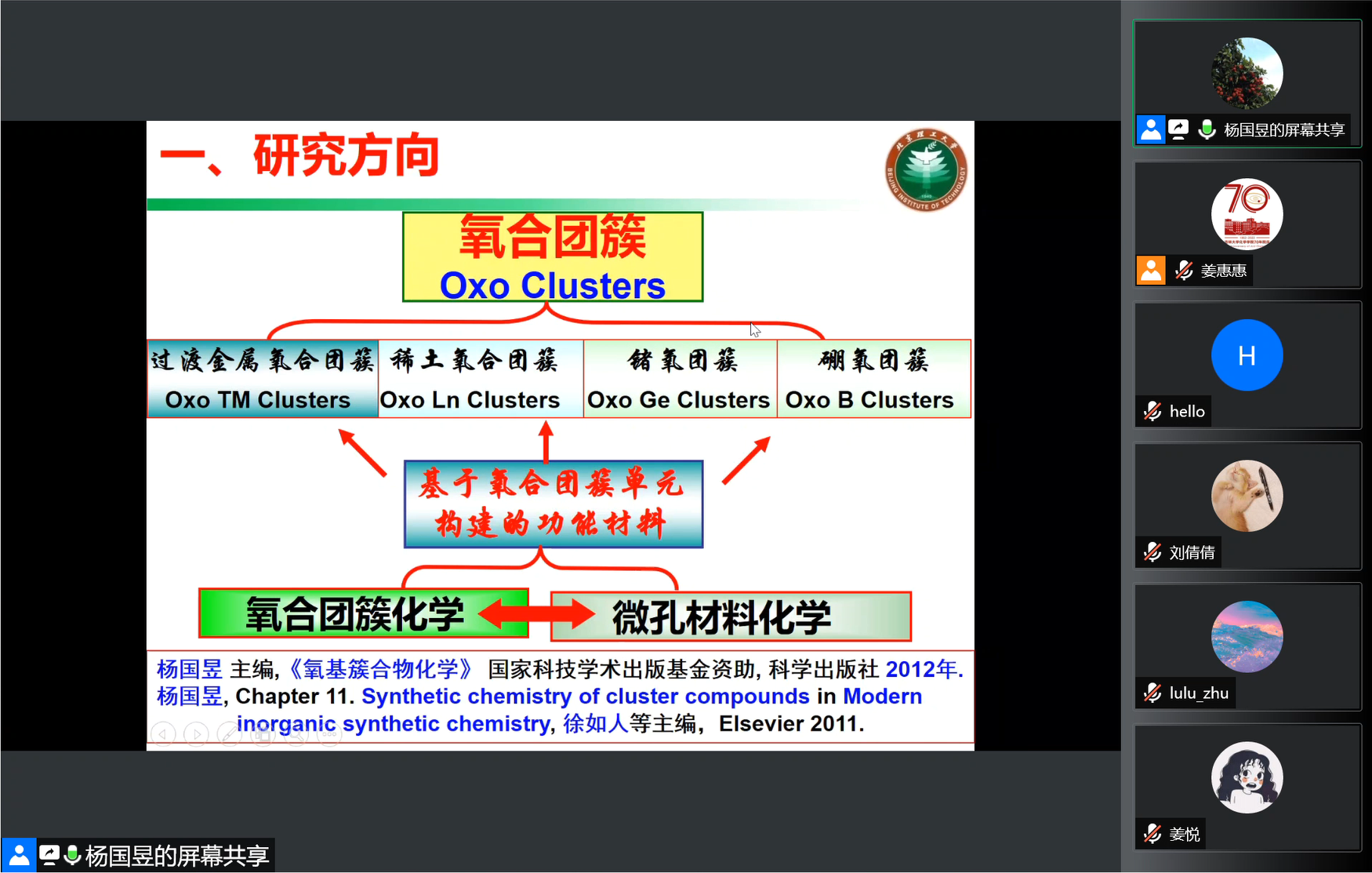 讲座中,杨国昱教授围绕氧合团簇化学,全面地介绍了其课题组在过渡金属氧簇、稀土氧簇、锗氧团簇及硼氧团簇等氧合团簇合成领域的研究进展。在交流互动环节,杨国昱教授耐心详细地解答了院内外师生的问题,并对相关领域的发展做出了展望。杏吧原创