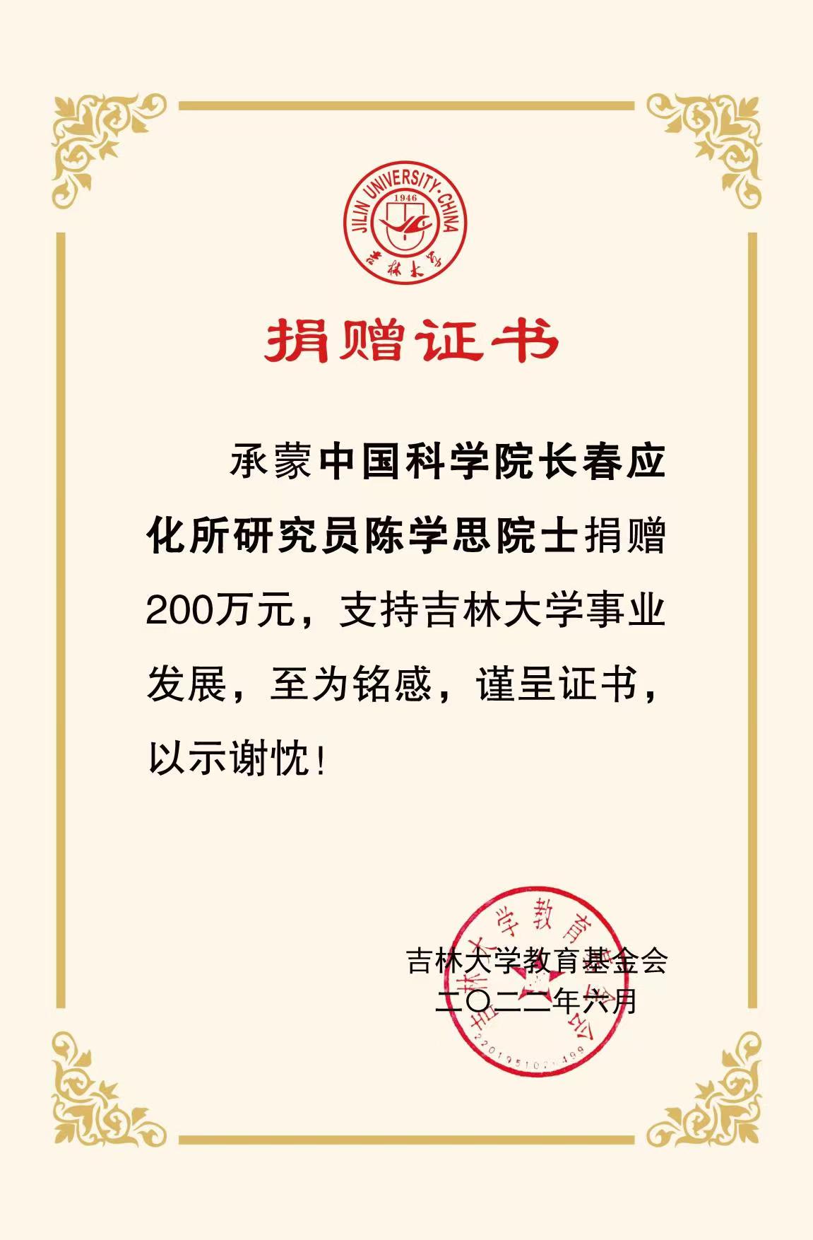 承蒙78级校友、中国科学院院士、中国科学院长春应用化学研究所陈学思研究员捐赠200万元,支持杏吧原创 “关实之—陶慰孙奖学金”发展,至为铭感,谨呈证书,以示谢忱!