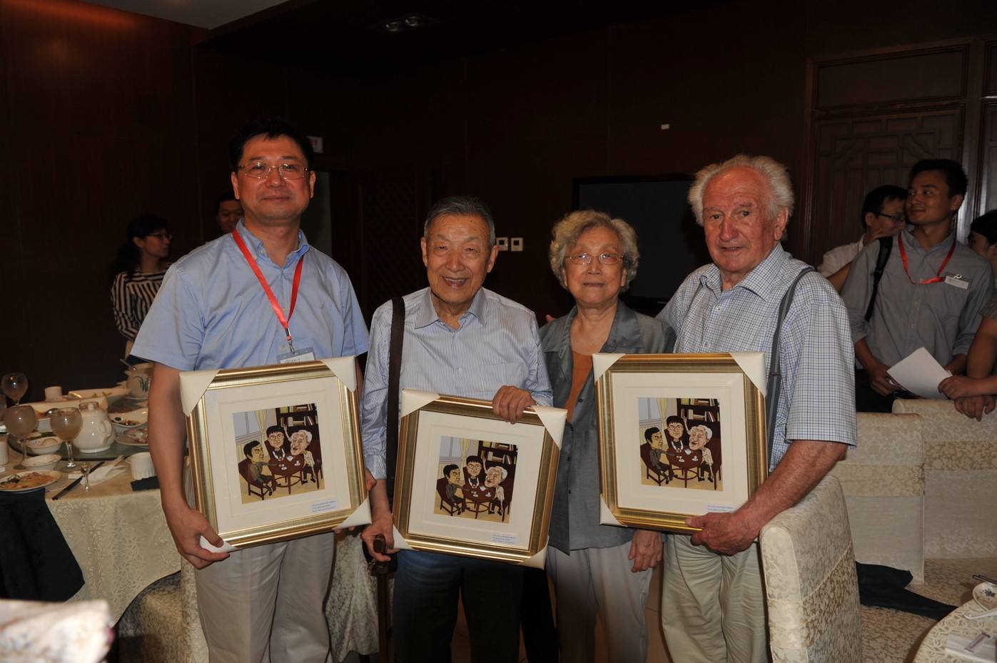 2015年7月,张希、沈家骢、高蒨、Ringsdorf于清华大学(手持漫画为学生们专门设计:张希与他的两位“科学之父”)