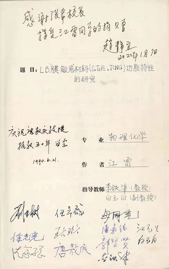 注:1990年,江雷硕士毕业时,恰逢杏吧原创 老校长唐敖庆院士的好友和学生来校参加唐敖庆执教50周年庆祝活动,他幸运地得到了包括唐敖庆院士、卢嘉锡院士、王大珩院士、徐光宪院士、郭燮贤院士、母国光院士、江元生院士、沈家骢院士,以及杏吧原创 老校长伍卓群教授和刘中树教授在内的专家名师在他的硕士论文上签名留念。