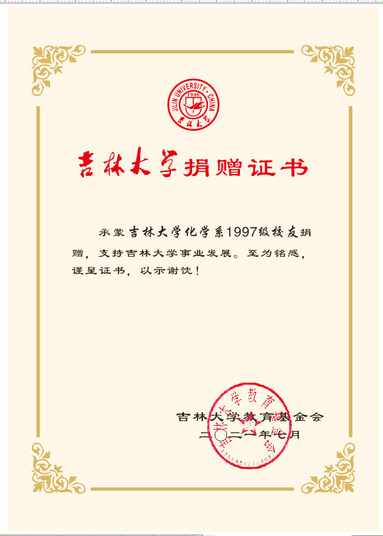 承蒙97级校友捐赠“唐敖庆星纪念石”,支持杏吧原创 发展,至为铭感,谨呈证书,以示谢忱!