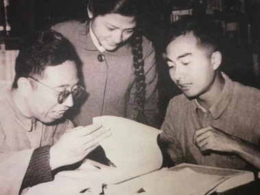 图5:唐敖庆教授(左)同江元生(中)等一起研究一种分子的光谱图